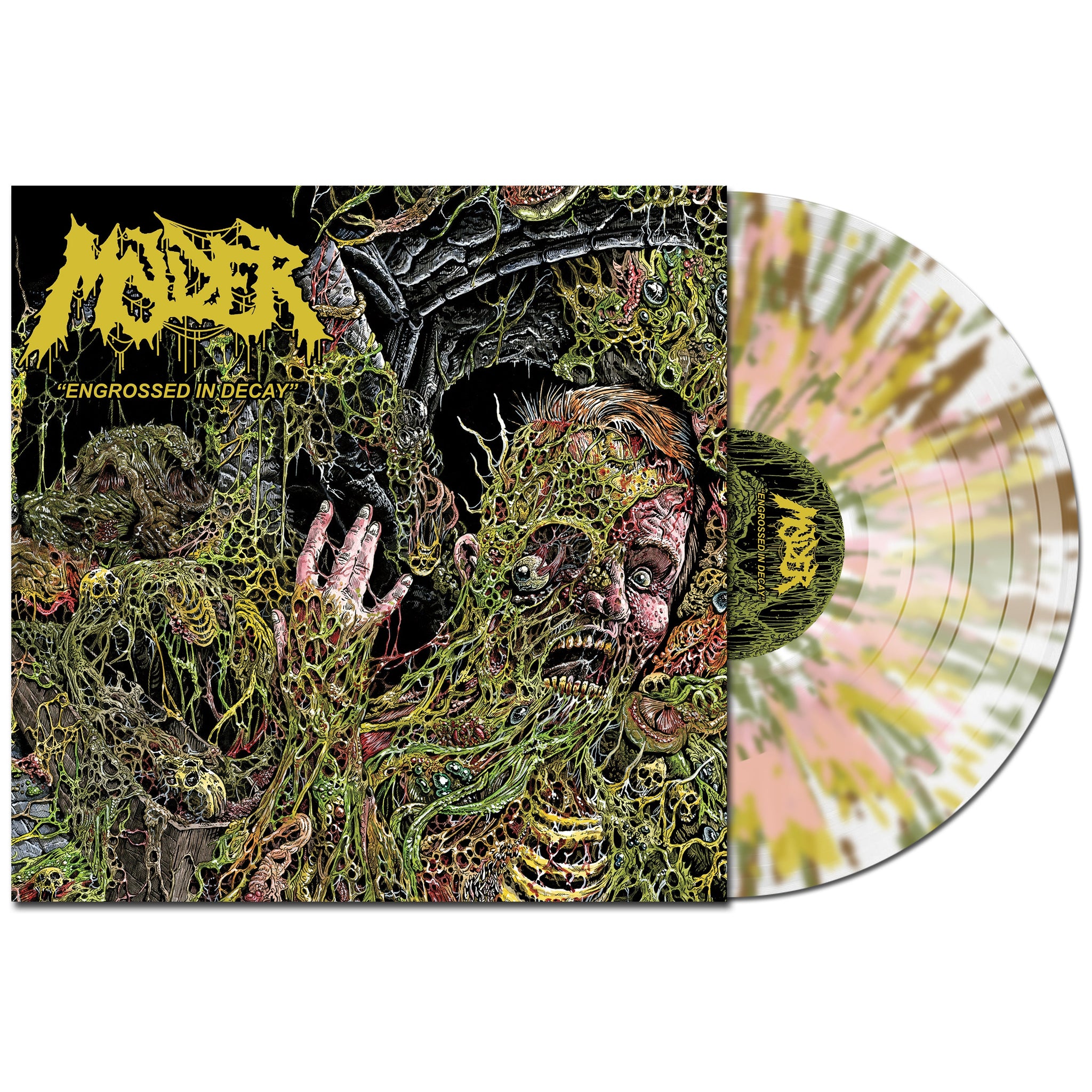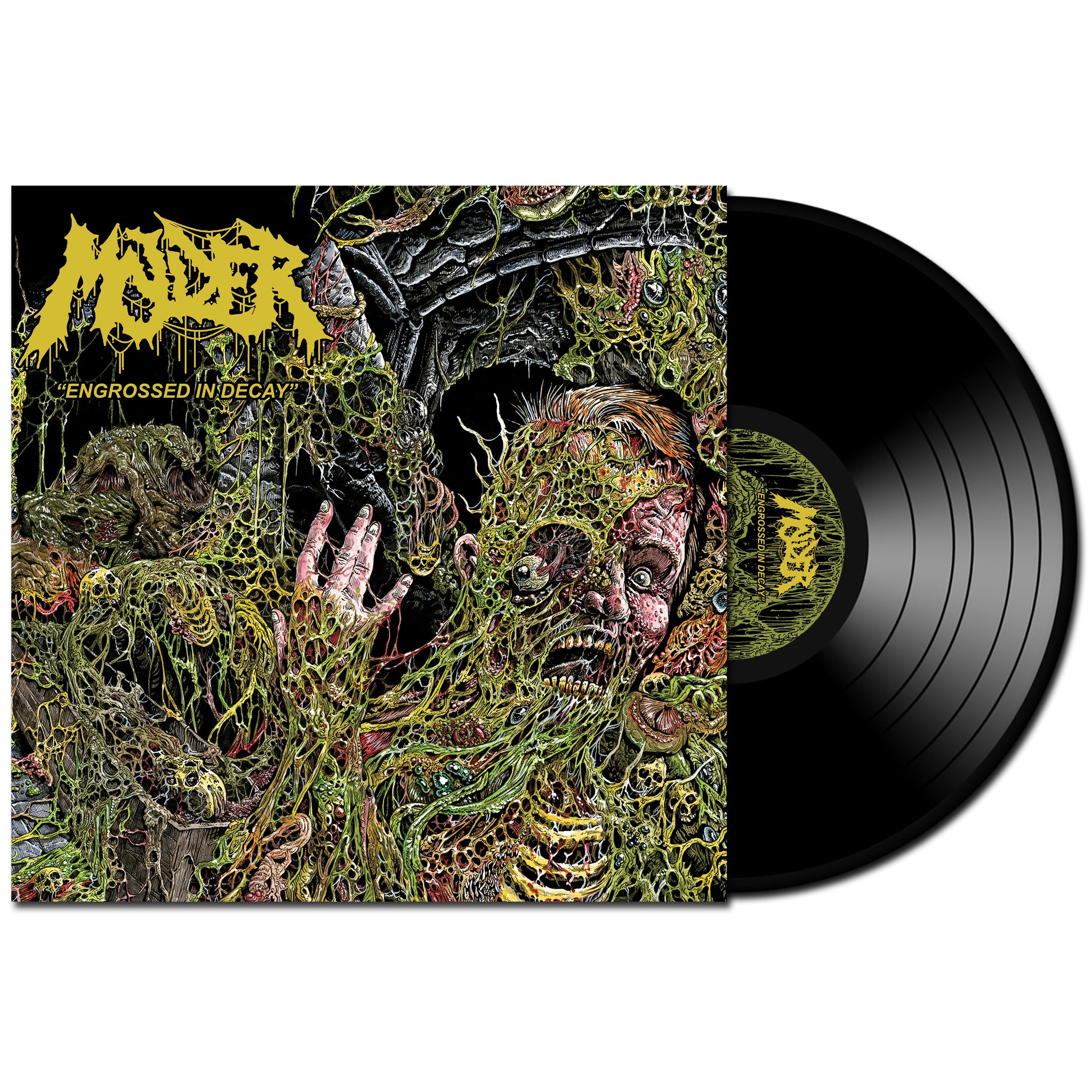 Upstarts Molder crawl out of the boneyard with renewed vengeance on their sophomore full-length Engrossed in Decay. For the uninitiated, the Joliet, Illinois-based quartet parlay old-school death metal vibes—think Impetigo meets Asphyx—with an insatiable present-day hunger. Comprised of Aaren Pantke (vocals/guitar), Dominic Vaia (bass), Kyle Pooley (Drums) and newcomer Carlos Santini (guitar), Molder’s primary goal isn’t to score deference points but to keep deathly flames alive. This is tried and true death metal with a palpitating (possibly undead) Midwestern heart. Between bong hits, Braindead marathons, and sarcophagus juice shots, Molder step out of the dark and into the light with Engrossed in Decay.